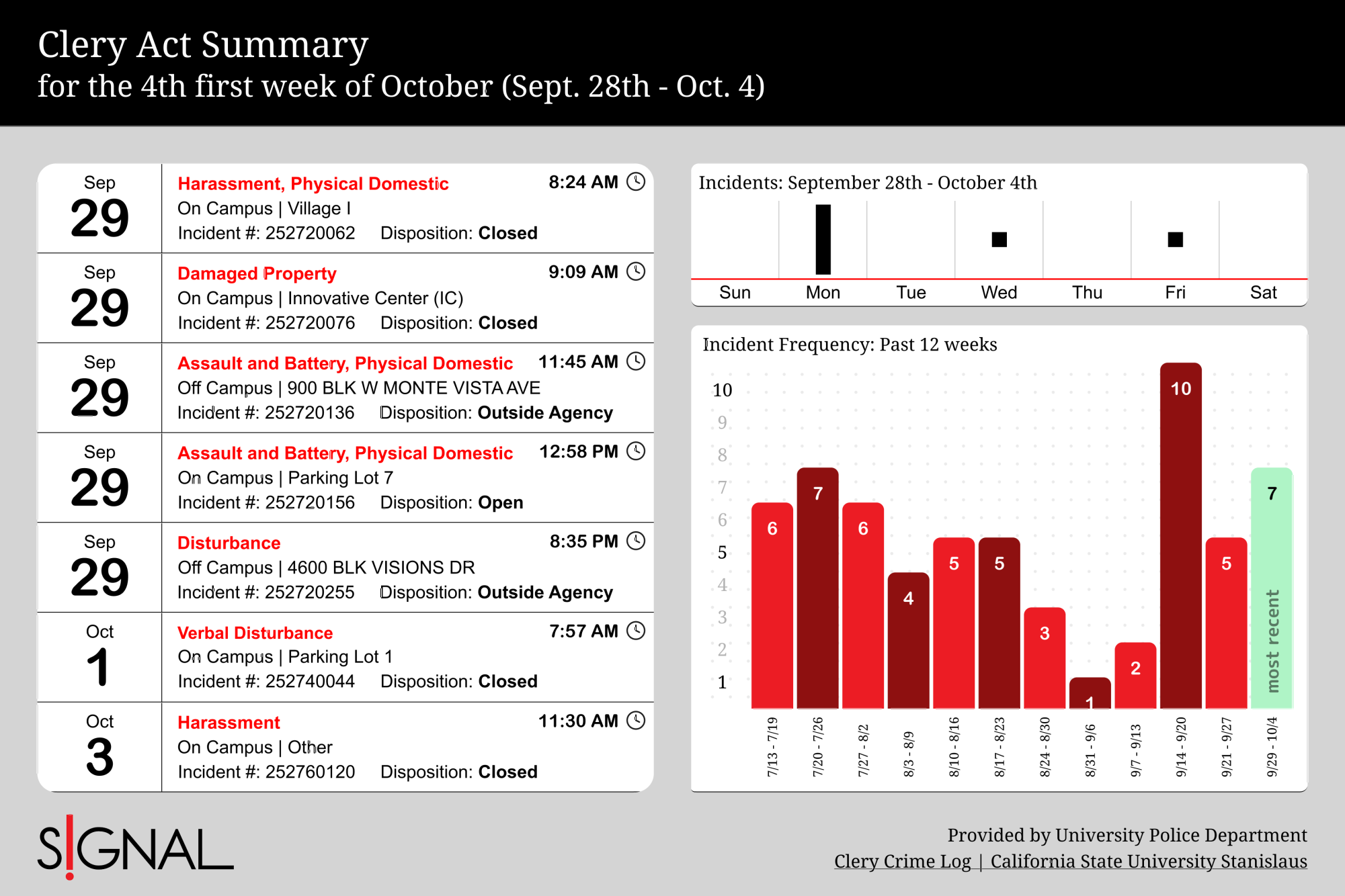 The infographic includes a frequency graph of incidents over the past 12 weeks. The mean frequency increased to 5.08 compared to 5.00 the previous week. The third week of September, with 10 incidents, remains an all-time high for the fall semester.